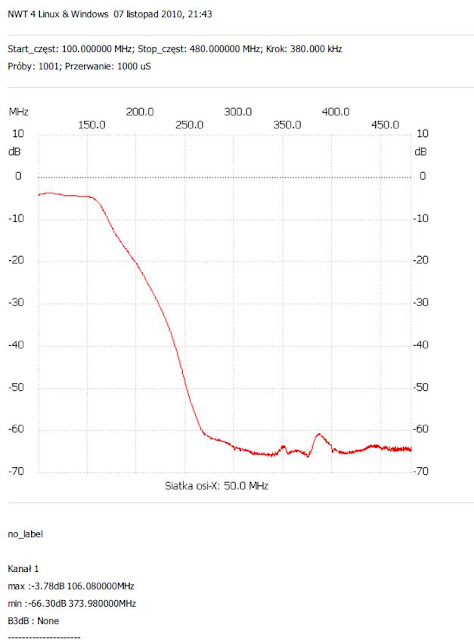 ...Załączam rysunek konstrukcji i charakterystykę filtru dla 1,5kW mierzoną NWT. Przy czym NWT okazało się, że nie miał włączonej kalibracji, stąd tłumienie w paśmie przepustowym wydaje się duże. Nie było możliwości powtórnych pomiarów, bo wzmacniacza już nie było. Dodatkowo zdjęcie filtru pracującego we wzmacniaczu 400W. Dane cewek są jednakowe, drut trochę cieńszy, ale tu zamienione są miejscami cewki LF1 z LF3. Do wyprowadzenia kabli użyłem zmodyfikowanych gniazd BNC...