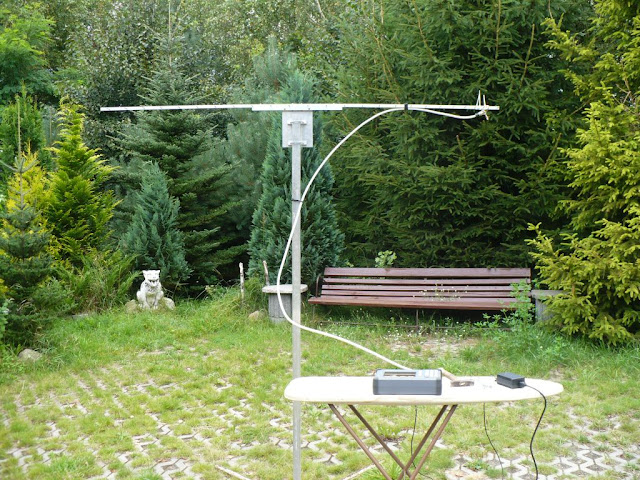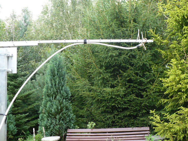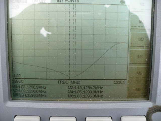 Przesyłam kilka zdjęć innego sposobu wykonania anteny pod kątem wypadowym !!! Antena jest składana z dwóch 1 metrowych części co widać na zdjęciu. Jest zabezpieczona farbą, żeby elementy się nie przemieszczały, a dodatkowo wibrator jest pokryty lakierem bezbarwnym zabezpieczającym przed bezpośrednim wpływem warunków atmosferycznych. N azdjęciach widac poszczególne fazy strojenia anteny, a końcowy rezultat SWR = 1:1.06 w paśmie 2 MHz , a na f=1296,300 SWR=1:1.04 ! Z poważaniem Janusz SP 2 CNW